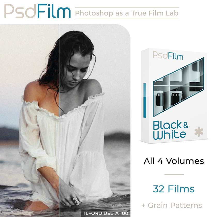 32 Vintage Black and White Films Emulated as Photoshop Actions, including Scanned Film Grain Patterns.